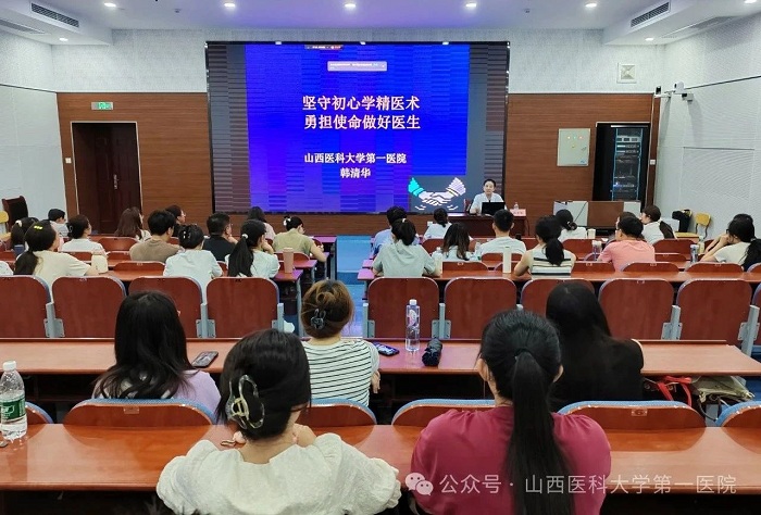 副院長韓清華以“堅守初心學精藝術,勇擔使命做好醫生”為題,結合自己從醫三十多年的經歷為學員們上了一堂精彩生動的醫學人文課,寄語學員不忘醫者初心、踐行醫者使命,在三年的規培中學有所成,成長為一名合格醫生。