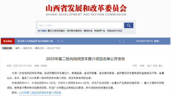 為進(jìn)一步激發(fā)民間投資活力,推動(dòng)民營(yíng)經(jīng)濟(jì)高質(zhì)量發(fā)展,在省委、省政府的統(tǒng)籌部署下,省發(fā)展改革委、省民營(yíng)經(jīng)濟(jì)發(fā)展局組織省直相關(guān)廳局、省屬企業(yè)、各市,精心遴選并推出2025年第二批向民間資本推介項(xiàng)目。