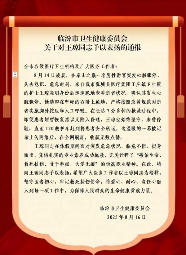 8月15日,一則發(fā)生在泰山之巔的暖心救援事跡在網(wǎng)絡(luò)上廣泛傳播,引發(fā)無(wú)數(shù)網(wǎng)友點(diǎn)贊,事件主人公——翼城縣醫(yī)療集團(tuán)王莊鎮(zhèn)衛(wèi)生院護(hù)士王瓊的善舉,如同一束光照亮了人心。